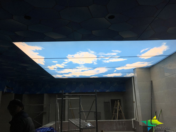 臨沂軟膜天花案例-沙埠莊洗浴中心水立方藍天白云軟膜吊頂案例 安裝效果如下圖: